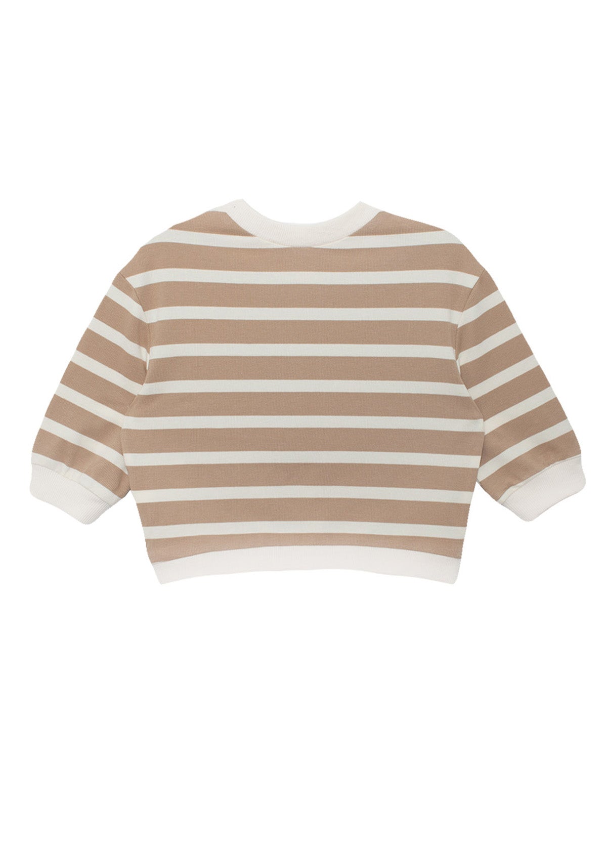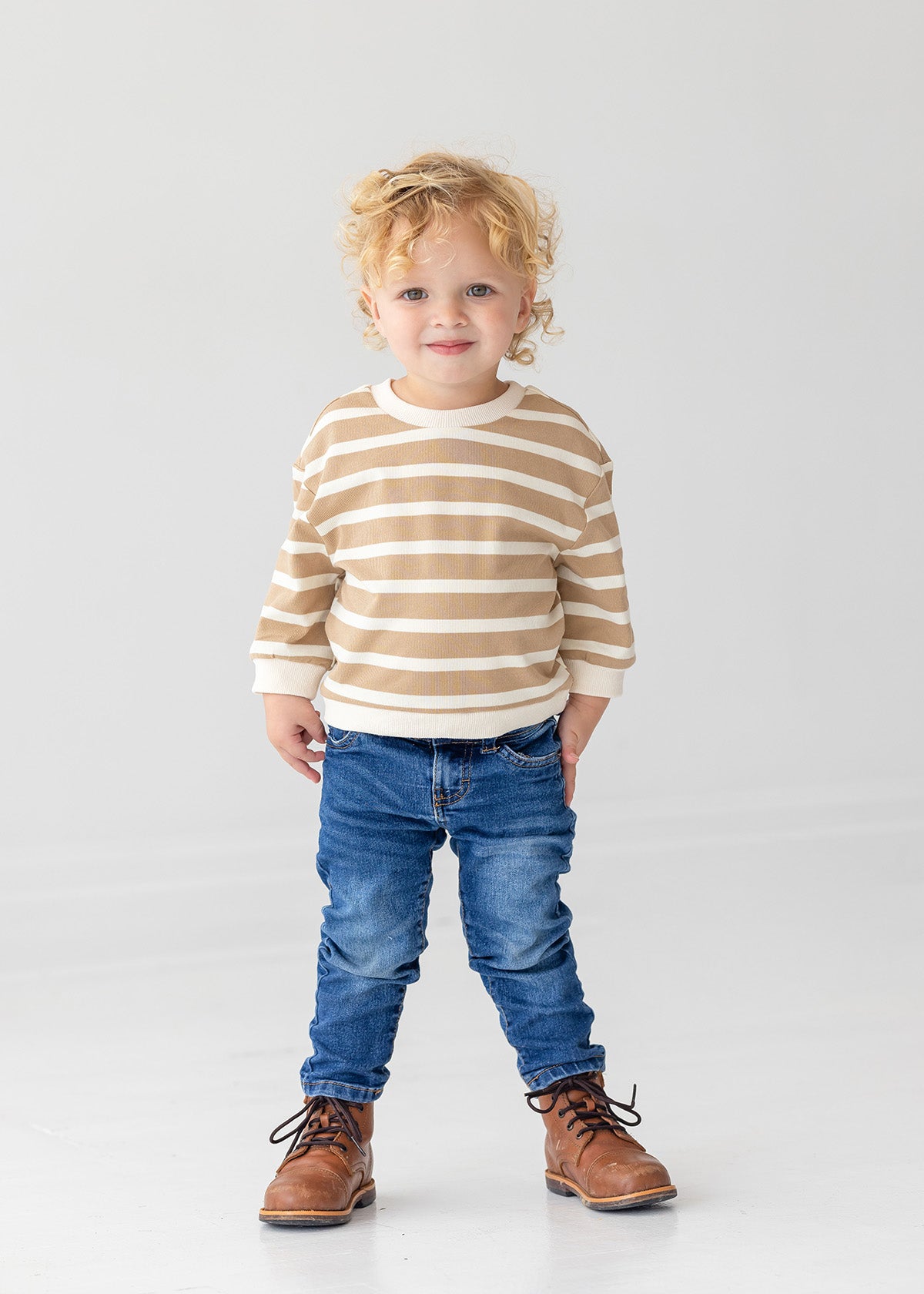 With its clean, horizontal stripes in light tan and white, the Mason top adds style to any outing. Featuring a soft, round collar and matching white cuffs, this long-sleeve shirt combines simplicity with versatility. Perfect for layering or wearing alone, it?s the ideal piece for everything from playdates to family dinners.